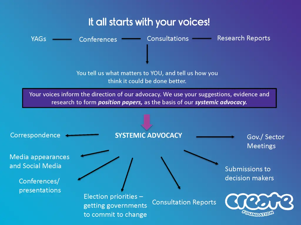 CREATE does a lot of things – which can make it a little confusing to figure out HOW we actually make change. So we put together a little chart to talk through all the ways we can change the care system – and showing why we need your help! Your voices are the key to how we create change, from beginning to end!